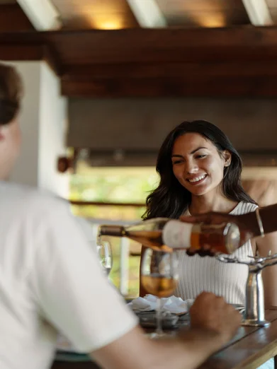 A curated wine selection of global labels complements each dish, enhancing the dining experience in a dreamy tropical setting