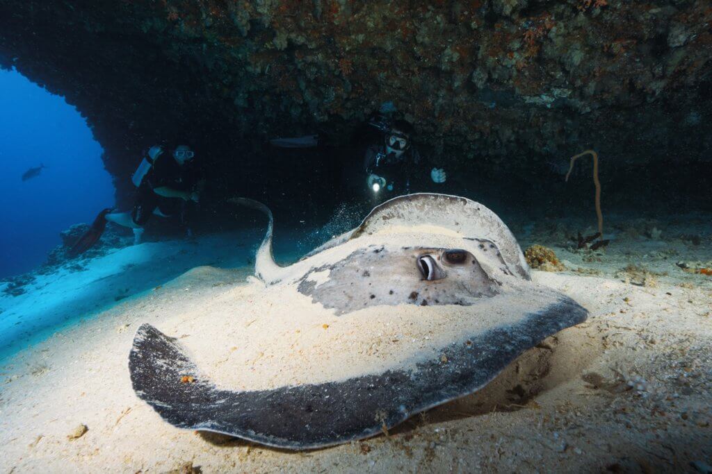 This beautiful ray has an exceptionally long whip tail that is more than twice the length of its body which is excellent for manoeuvring.